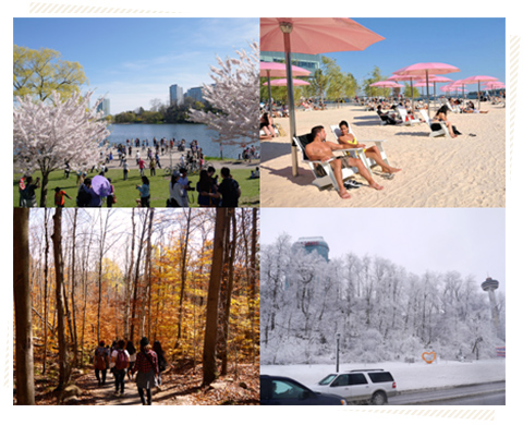 トロントの夏は、気温が高くなっても湿度が低いため比較的過ごしやすく、冬はとても寒くなります。しかし、トロントはHorse Shoeと呼ばれるオンタリオ湖の湖畔沿いに位置しているため、カナダの他の都市よりも比較的温暖です。日本のようなはっきりとした四季の区別はなく、冬から急に夏、夏から急に冬に季節が移り変わります。 カナダと聞くと『厳しい冬』という印象を持たれる方が多いようですが、都市部は地下街が発達しており、また、どの建物も二重窓、セントラルヒーティングが完備されているため屋内はとても暖かく感じます。